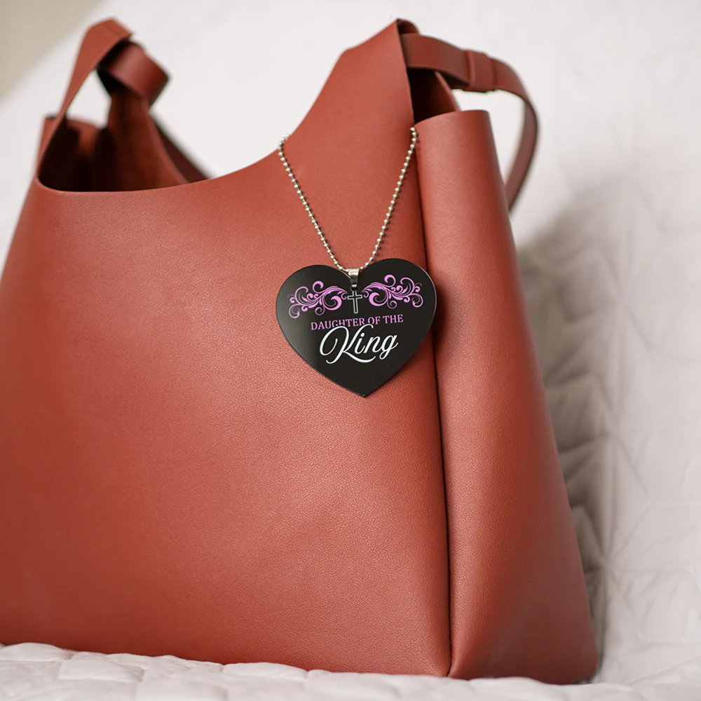 Declare your royal identity with this elegant heart-shaped acrylic ornament, featuring the empowering message âDaughter of the King.â At 3.2 inches wide and hung on a 9.5-inch silver ball chain, itâs a beautiful symbol of worth, purpose, and divine belonging.